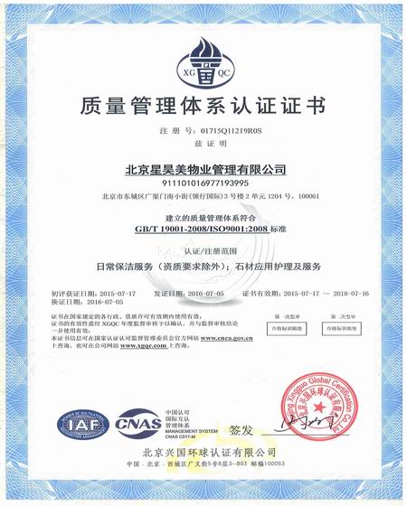 经过星昊美物业人不断地总结提炼,浓缩出“团结、开拓、求实、高效”的企业发展信条。在发展过程中,公司通过ISO 质量 / 环境 / 职业健康管理体系认证,以科学的管理体系做保障,最大限度地杜绝了服务的随意性,为高品质的服务奠定了坚实的基础。同时,公司注重全新理念与服务方式的应用,通过月度质检、定期回访、满意度测评等多种手段监测服务效果,根据客户关注焦点持续改进,提供的服务品质不断超越客户期待,不仅得到了业界的普遍认同,更得到了客户的。